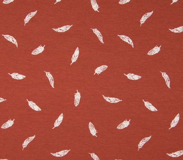 Angeboten wird hier ein Baumwolljersey mit weißen Federn auf rost/orange.